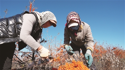 本报讯(记者 隋爱军 实习记者 藏哈尔·波拉提 娜迪亚·哈依拉提)近日,布尔津县阔斯特克乡阔斯特克村村民王路军种植的沙棘进入采收季,橘红色的沙棘果挂满枝头,红透田野。