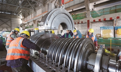 近日,兵团第十师北屯市热电联产(背压式)集中供热项目建设现场,工人们正在安装汽轮机。据了解,该集中供热项目总投资4.16亿元,项目建成投产后可新增供热能力240万平方米,每年可发电1.73亿千瓦时,将进一步提升当地供热供电质量和效率。目前,施工方组织500多名工人抢工期、赶进度,确保年底整套机组进行调试。 通讯员 李正虎 易雪雁 摄