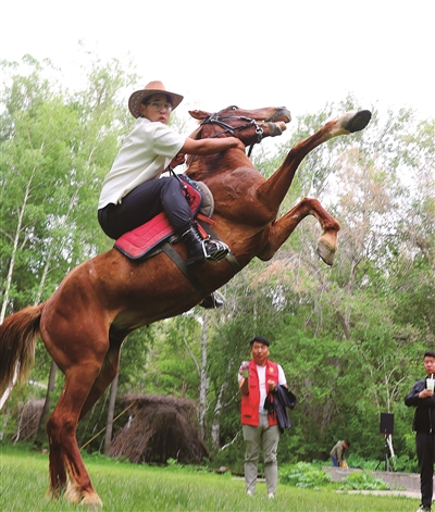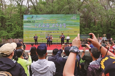 国家4A级旅游景区——阿勒泰市桦林公园位于克兰河谷中,属国家二级公益林。这里植物种类繁多,可谓“天然氧吧”。在这里,自驾游爱好者欣赏了非遗乐器展示、阔麦依表演,更加惊喜的是,《我的阿勒泰》主题曲原创还现场演唱了《月光》,歌声婉转悠扬,令人陶醉。此外,还有剧中本土演员分享拍戏中的精彩故事、自驾游爱好者免费领取茶芭蕾《我的阿勒泰》联名同款饮品和雪都冰泉低氘水,以及一牧场马术基地专业骑手现场带领游客体验骑马。