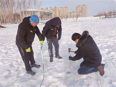 在福海县冰上运动中心,记者看见工作人员在冰面上进行冰漆喷涂,严格把控喷漆厚度和均匀度,确保每一寸冰面都能被完美覆盖。特制的冰漆在低温下迅速附着于冰面,为后续赛道划线提供清晰底色,有助于提升冰面的质感和滑度。