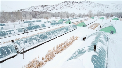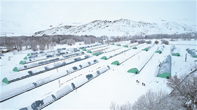 从1月1日夜间开始,阿勒泰地区大部迎来降雪,位于阿勒泰市拉斯特乡的阿勒泰市吉林援疆现代农业博览园里的数座蔬菜大棚被积雪覆盖。为保障蔬菜大棚正常运行,该博览园组织员工及时清理大棚积雪、增加覆盖物,并加紧采收已成熟的蔬菜,保障“菜篮子”供应充足。记者 阿尔达克·拜斯汗 摄