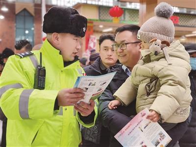 活动中,民警们手持道路交通安全宣传资料和宣传品,向广大群众讲解交通安全知识和春运期间安全出行注意事项,引导大家如遇到超员和违法载人车辆,要及时向公安机关举报,从源头上消除交通安全隐患。