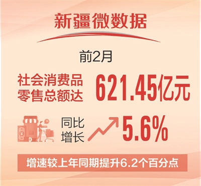 新疆日报乌鲁木齐3月26日讯(石榴云/新疆日报记者 黑宏伟)从自治区商务厅获悉:1—2月,全疆消费市场活力持续释放,社会消费品零售总额达621.45亿元,同比增长5.6%,增速较上年同期提升6.2个百分点。