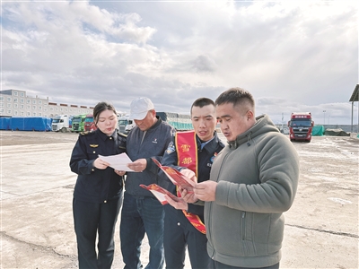 活动中,联合宣传组来到口岸货场、物流企业等场所,通过悬挂宣传横幅、发放宣传手册,向出入境司机、外贸从业人员及边民普及《中华人民共和国国家安全法》《中华人民共和国反间谍法》等法律法规。民警结合典型案例,详细讲解了如何防范间谍活动、举报可疑出入境行为等方法;吉木乃口岸国际道路运输管理局工作人员则重点解读了国际道路运输安全规范,提醒从业人员依法经营,杜绝走私、夹带违禁物品等违法行为。