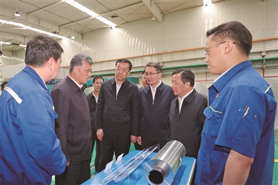 五月七日,自治区党委书记马兴瑞在乌鲁木齐调研。这是马兴瑞来到位于乌鲁木齐甘泉堡经济技术开发区的新疆众和股份有限公司,察看铝箔产品生产和展示,与相关负责人深入交流。 □石榴云/新疆日报记者 崔志坚 摄
