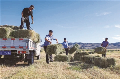 近日,阿勒泰边境管理支队吐尔洪边境派出所组建党员先锋队,帮助辖区农牧民收割、搬运及打捆草料。
