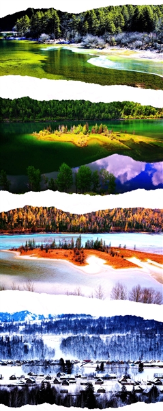 南麓北疆七城^②,如北斗拱月;东山西水二湖^③,成新疆名片。阿勒泰,人类滑雪起源地^④;吉木乃,炊烟初升洞通天^⑤。三道海子,秘境寻踪,处机真人,勒马青河^⑥;两弹一星,功勋矿脉,可可托海,奇峰钟山;布伦托海,烟波浩渺,农牧渔油,物阜民丰;童话北疆,诗与远方,牧野生活,那仁草原;喀纳斯湖,丽景三湾,古村禾木,别有洞天。