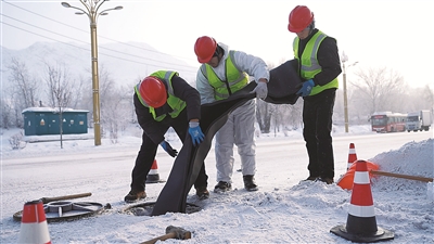 阿勒泰市金山供水有限责任公司员工对浅埋检查井进行保温处理。 通讯员 宋湖拉·沙布尔江 摄