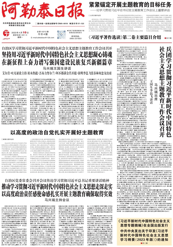 - 坚持用习近平新时代中国特色社会主义思想凝心铸魂 在新征程上奋力谱写强国建设民族复兴新疆篇章 新疆日报乌鲁木齐4月8日讯(石榴云/新疆日报记者 王兴瑞)自治区学习贯彻习近平新时代中国特色社会主义思想主题教育工作会议4月8日在乌鲁木齐召开,深入学习贯彻习近平总书记在中