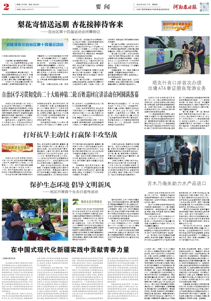 - 打好抗旱主动仗 打赢保丰攻坚战 本报讯(实习记者 阿丽娜·阿依登)今年7月以来,地区出现持续晴热高温少雨天气,根据气象水文预测,2023年夏季(6—8月),预计气温较常年偏高1℃左右,降水偏少2成左