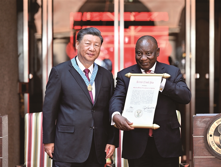 会谈后,拉马福萨向习近平授予“南非勋章”,这是南非授予重要友好国家元首的最高级别勋章和最高荣誉。