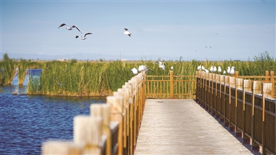 近日,在兵团第十师北屯市一八三团芦花湖,一群水鸟在木栈道上栖息,成为湖上一道亮丽风景。