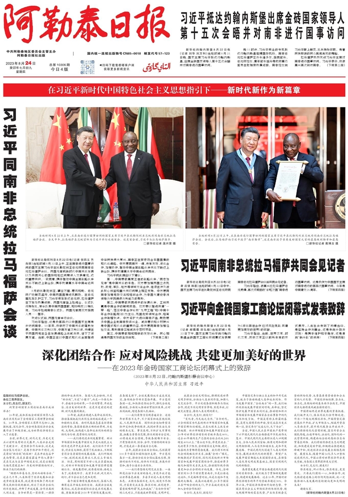 - 习近平向金砖国家工商论坛闭幕式发表致辞 新华社约翰内斯堡8月22日电(记者 郝薇薇 田弘毅)当地时间8月22日下午,国家主席习近平向约翰内斯堡金砖国家工商论坛闭幕式发表题为《深化团结合作 应对风险挑战 共建更加美好的世界》的致辞。