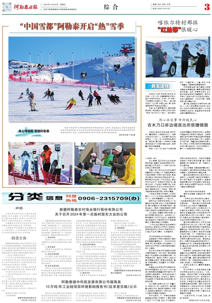 - 新疆阿勒泰农村商业银行股份有限公司 关于召开2024年第一次临时股东大会的公告 新疆阿勒泰农村商业银行股份有限公司(以下简称“本行”)2023年12月19日召开的第二届董事会第二十一次临时会议决定,本行定于2024年1月11日(周四)召开2024年第一次临时