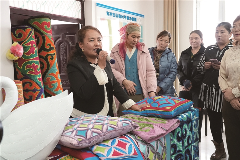 努尔古丽·卡丁开了一家刺绣店,并带动身边姐妹在闲暇之余绣出精美刺绣工艺品,成为助推当地妇女实现就近就地灵活稳定就业与增收致富的“巧手”产业。