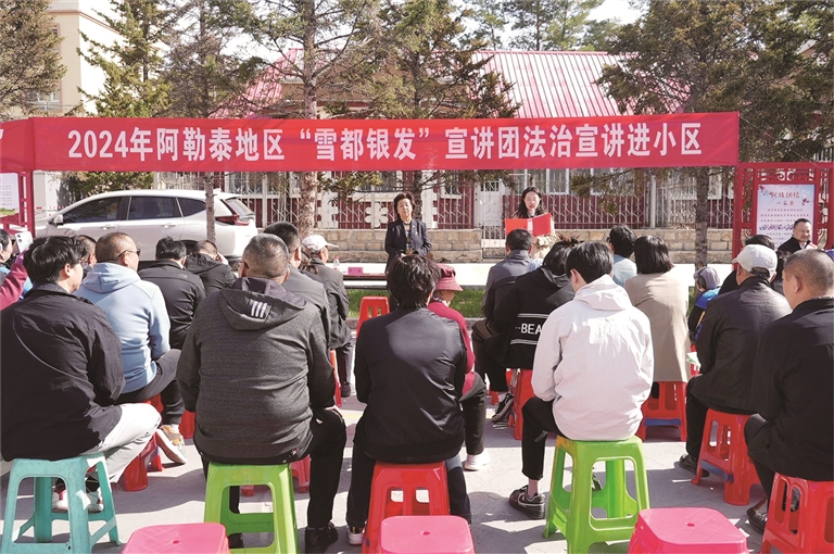 本报讯(实习记者 包洪宇)4月20日,地委老干部局联合地区司法局组织地区“雪都银发”宣讲团走进阿勒泰市解放路街道解放路社区行署小区,开展法治宣讲活动。