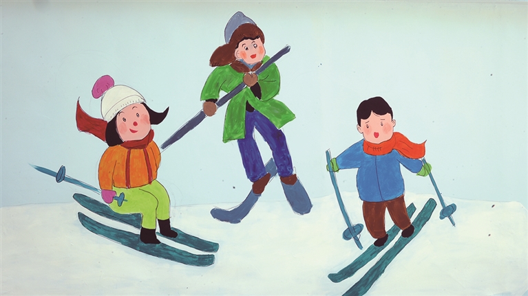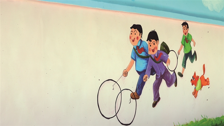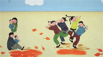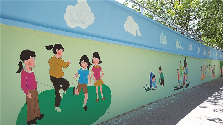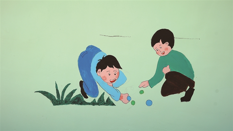 墙面上用卡通画描绘了跳皮筋、滚铁环、丢手绢、老鹰抓小鸡等具有时代特征的儿童游戏场景,这些游戏曾风行于上世纪七八十年代,唤起了人们对美好童年的回忆。记者 代维利 摄