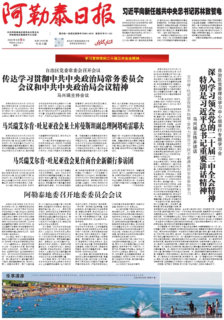 - 阿勒泰地委召开地委委员会会议 本报讯(记者 常轶茹 王宽 实习记者 彭林海)8月1日,阿勒泰地委召开地委委员会会议,传达学习贯彻习近平总书记在党的二十届三中全会上的报告和重要讲话精神,传达学习贯彻中共中央政治局会议