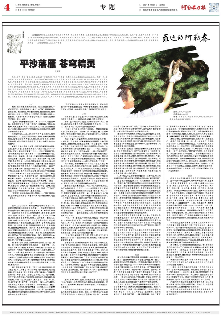 雁鸣、旷野、隽永、留白,这是古琴曲《平沙落雁》给“大头”的感受,也是阿尔泰山动植物给我的画面感。积雪一化,雁鸣声声,萧瑟的冬季即将告别,“万象更新图”粉墨登场……阿尔泰葱、阿尔泰大黄、阿尔泰大戟、阿尔泰地蔷薇、阿尔泰独尾草、阿尔泰多榔菊、阿尔泰飞蓬、阿尔泰狗娃花、阿尔泰百里香、阿尔泰郁金香、阿尔泰藜芦、阿尔泰野青茅、阿尔泰异燕麦、阿尔泰溚草等。有行走的“活地图”之称的海鹰教授立即掏出纸和笔,在上述阿尔泰山“土特产”14种植物后哗啦啦又添加了27种道地植物:阿尔泰羽节蕨、阿尔泰铁脚蕨、阿尔泰蝇子草、阿尔泰金莲花、阿尔泰毛茛、阿尔泰牡丹草、阿尔泰葶苈、阿尔泰䊯芥、阿尔泰牡丹草、阿尔泰棘豆、阿尔泰野豌豆、阿尔泰黄芩、阿尔泰堇菜、阿尔泰瑞香、阿尔泰假狼毒、阿尔泰鹿蹄筋、阿尔泰马先蒿、阿尔泰忍冬、阿尔泰乳菀、阿尔泰橐吾、阿尔泰蒲公英、阿尔泰莴苣、阿尔泰黄鹌菜、阿尔泰羊茅、阿尔泰早熟禾、阿尔泰鹅观草、阿尔泰灯芯草。动物的还有,阿尔泰真鱥、阿尔泰林蛙、阿尔泰隼三种,共44种动植物。以某个地名命名的动植物数量之多,实属罕见,足以说明阿勒泰是动植物的天堂、动植物学家眼中的“基因种子库”。
