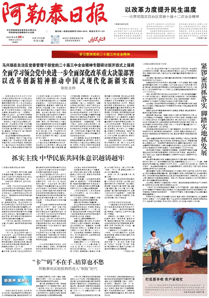 - 全面学习领会党中央进一步全面深化改革重大决策部署 以改革创新精神推动中国式现代化新疆实践 新疆日报乌鲁木齐8月27日讯 (石榴云/新疆日报记者 王兴瑞)自治区党委管理干部党的二十届三中全会精神专题研讨班8月27日上午在自治区党委党校开班。自治区党委书记马兴瑞出席开班式并作动员讲