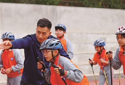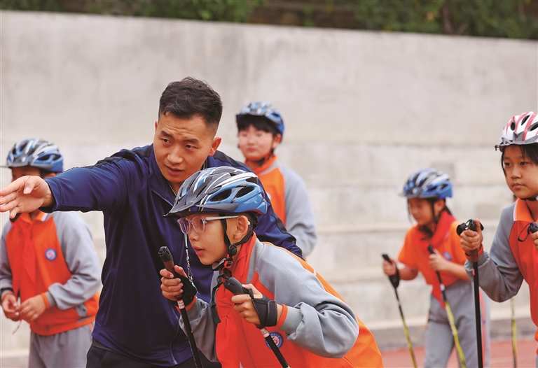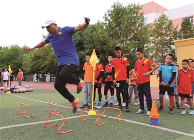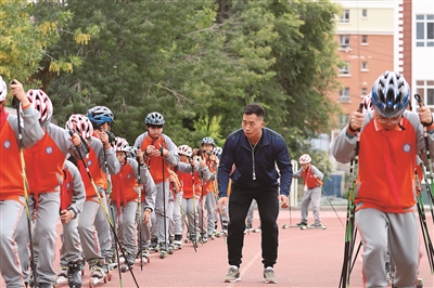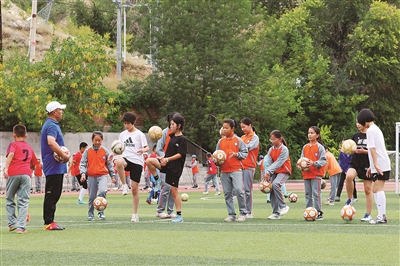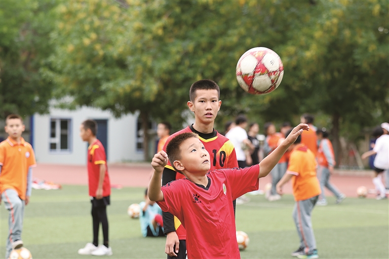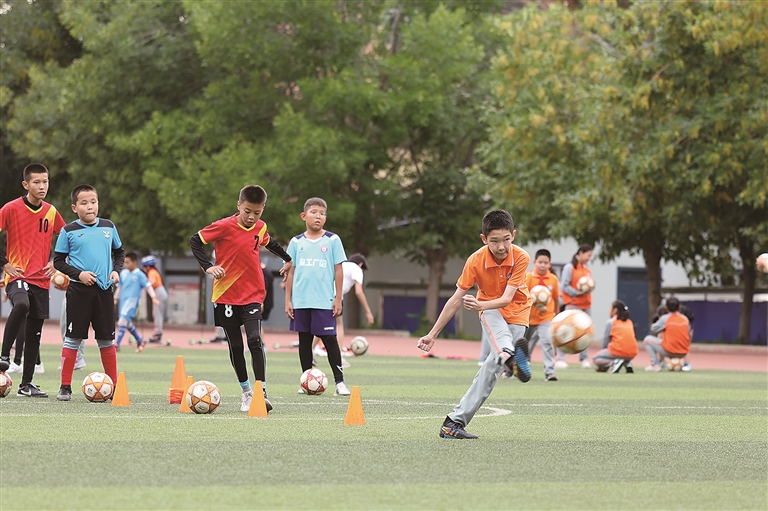 9月6日,阿勒泰市实验小学学生在体育课上练习足球、滑雪(滑轮)技巧。近年来,地区各中小学校确保学生每天锻炼1小时,设置内容丰富、形式多样的体育课程,推动中小学生文化学习和体育锻炼协调发展,促进青少年儿童健康成长。