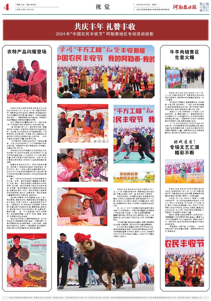 本报讯(记者 古丽娜 阿丽娜·阿依登 实习记者刘欢 彭林海)9月21日,在2024年“中国农民丰收节” 阿勒泰地区专场活动中,阿勒泰以其独特的自然风光与丰富的农牧资源,精心筹备了一场别开生面的专场活动——“阿勒泰特色农牧产品评选”,诚邀四方宾客共襄盛举,共享丰收的喜悦与成果。