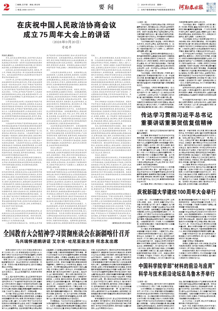 - 庆祝新疆大学建校100周年大会举行 (上接第一版) 对口支援高校和社会各界人士表示衷心感谢。他说,一百年来,新疆大学始终初心如磐、赤诚报国,始终树人育才、兴疆固边,始终踔厉奋发、追求卓越,为新疆乃至全国经济社会发展作出