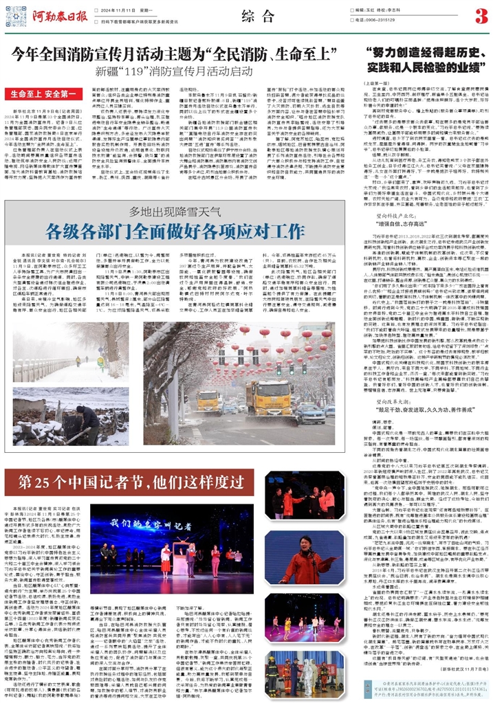 在布尔津县融媒体中心,全体采编人员载歌载舞、欢聚一堂,共同庆祝第25个中国记者节。“新闻工作虽然辛苦而忙碌,但很有意义,能为这个伟大的时代凝聚正能量,助力高质量发展,我感到荣幸与自豪。今后,我将不断学习,认真完成每一次采写任务,为热爱的新闻事业奉献青春和力量。”布尔津县融媒体中心记者加尔恒·阿热帕说。