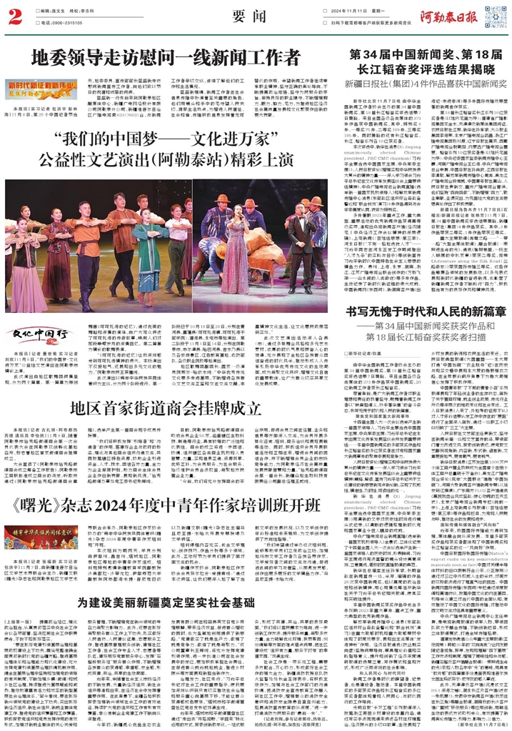 - 《曙光》杂志2024年度中青年作家培训班开班 本报讯(记者 张福新 实习记者 包洪宇)11月7日,由新疆维吾尔自治区文学艺术界联合会主办、新疆文联《曙光》杂志社和阿勒泰地区文学艺术界联合会承办、阿勒泰地区作家协会协办的“铸牢中华民