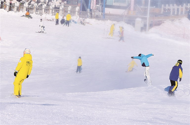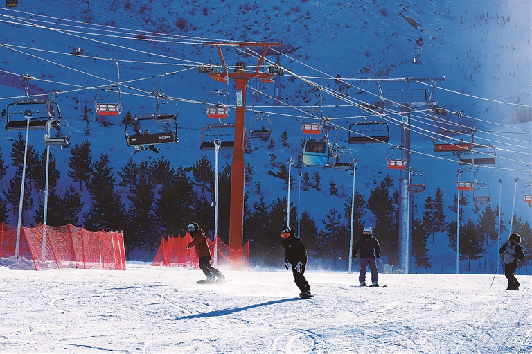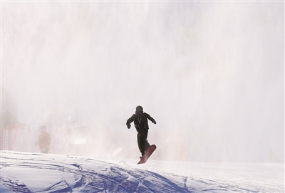 11月19日,滑雪爱好者在将军山国际滑雪度假区畅滑粉雪。