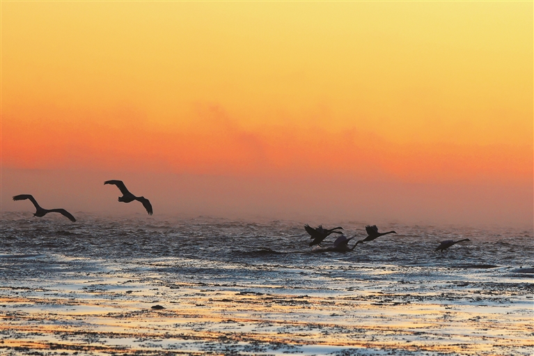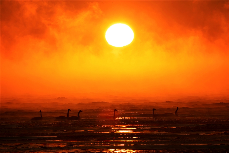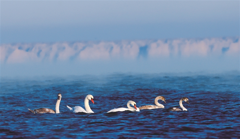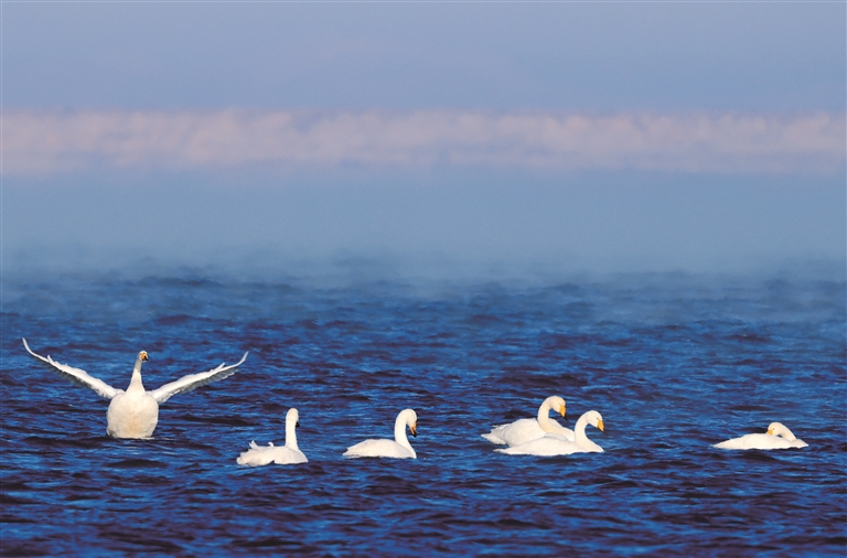 乌伦古湖国家湿地公园地处阿尔泰山前平原、准噶尔盆地北部,是中国十大内陆淡水湖,也是新疆北部最大的永久性淡水湖,这里丰富的水资源和多样的生态环境为天鹅等候鸟提供了理想的生存条件。近年来,随着持续加大生态保护和鸟类保护力度,该湿地公园吸引越来越多的美丽“访客”在此栖息、繁衍。今冬,疣鼻天鹅、大天鹅算是这些候鸟中的最后一批迁徙客。