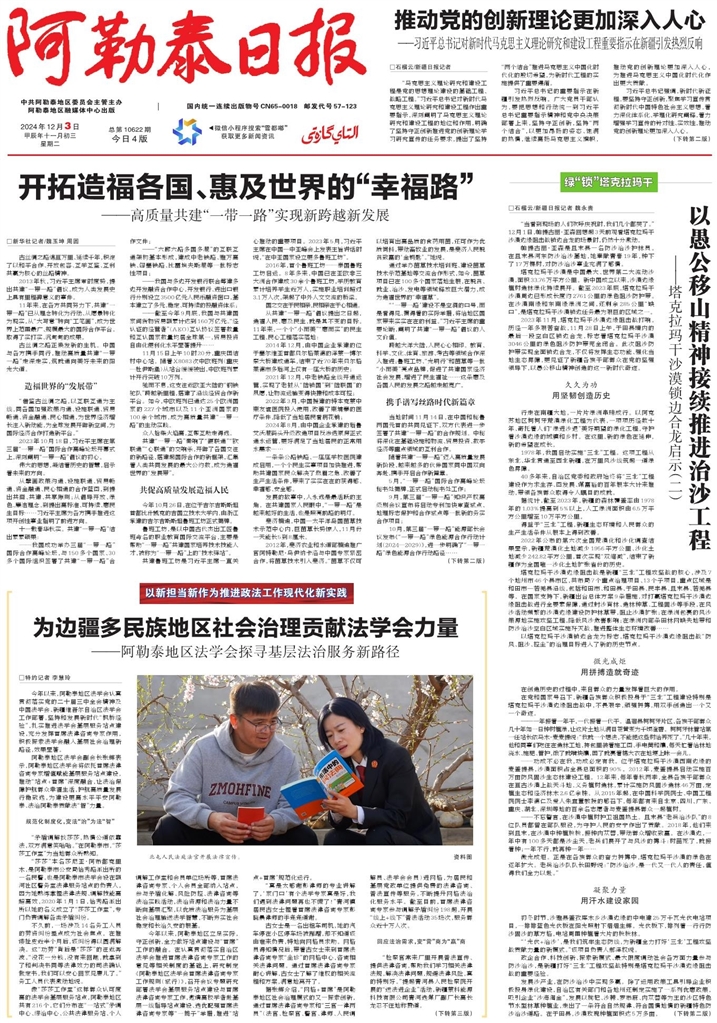 - 以愚公移山精神接续推进治沙工程 □石榴云/新疆日报记者 魏永贵 “当看到现场的人们欢呼庆祝时,我们几个都哭了。”12月1日,帕提古丽·亚森回想起3天前观看塔克拉玛干沙漠边缘阻击战锁边合龙的场景时,仍然十分激动。 帕