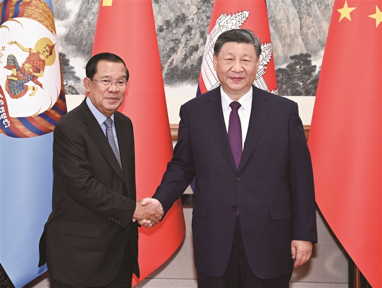 习近平指出,当前,国际形势变乱交织,全球性挑战层出不穷,考验着各国的应对和选择。中柬两国都致力于做世界的和平力量、发展力量、进步力量。中方将继续支持柬埔寨在国际和地区事务中发挥更大作用,壮大“全球南方”力量,支持东盟坚持战略自主,维护中心地位,坚决反对外部势力将冷战思维引入本地区,坚定不移推动东盟一体化和共同体建设。中方愿同柬方坚定道不改、志不变的决心,增强底线思维,加强协作和配合,共同应对各种风险。