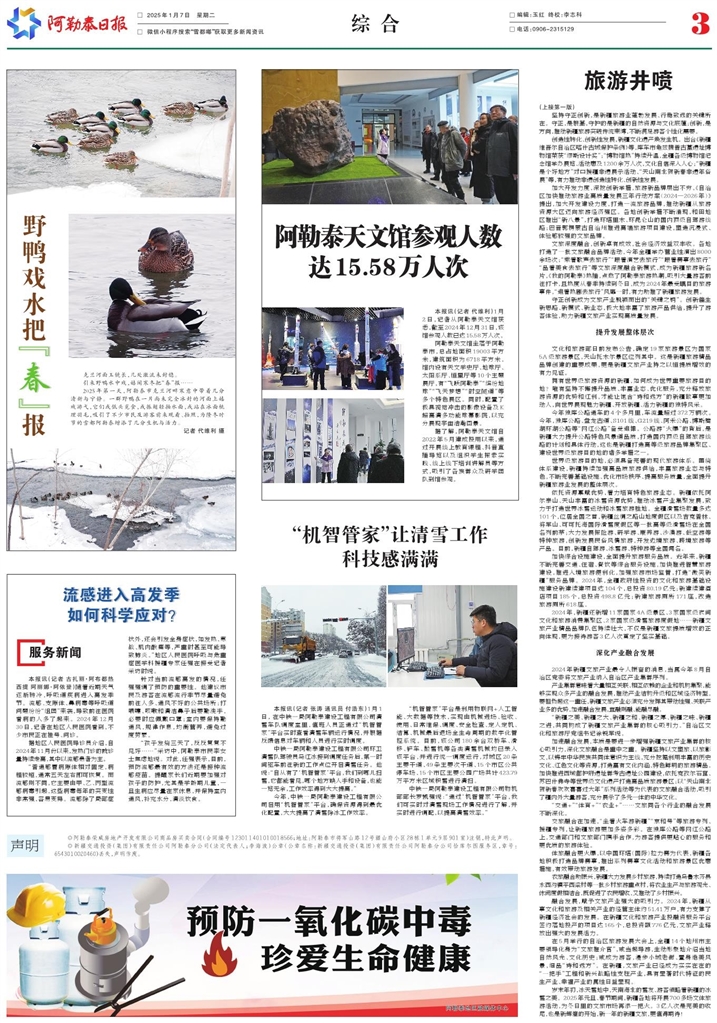 - 野鸭戏水把“春”报 克兰河面玉镜长,几处激流未封稳。 引来野鸭水中戏,嬉闹寒冬把“春”报…… 2025年第一天,阿勒泰市克兰河畔寒意中带着几分清新与宁静。一群野鸭在一片尚未完全冰封的河面上嬉戏游弋