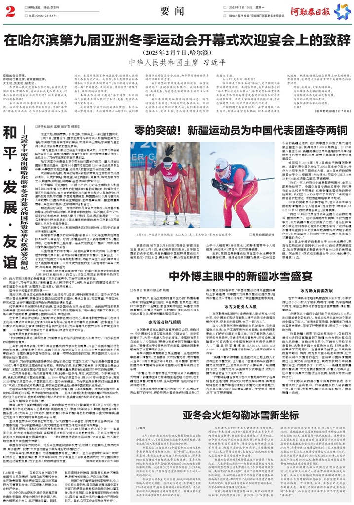 - 在哈尔滨第九届亚洲冬季运动会开幕式欢迎宴会上的致辞 中华人民共和国主席 习近平 尊敬的各位同事, 尊敬的巴赫主席、霍震霆副主席, 女士们,先生们,朋友们: 在中国人民欢度新春佳节之际,我谨代表中国政府和中国人