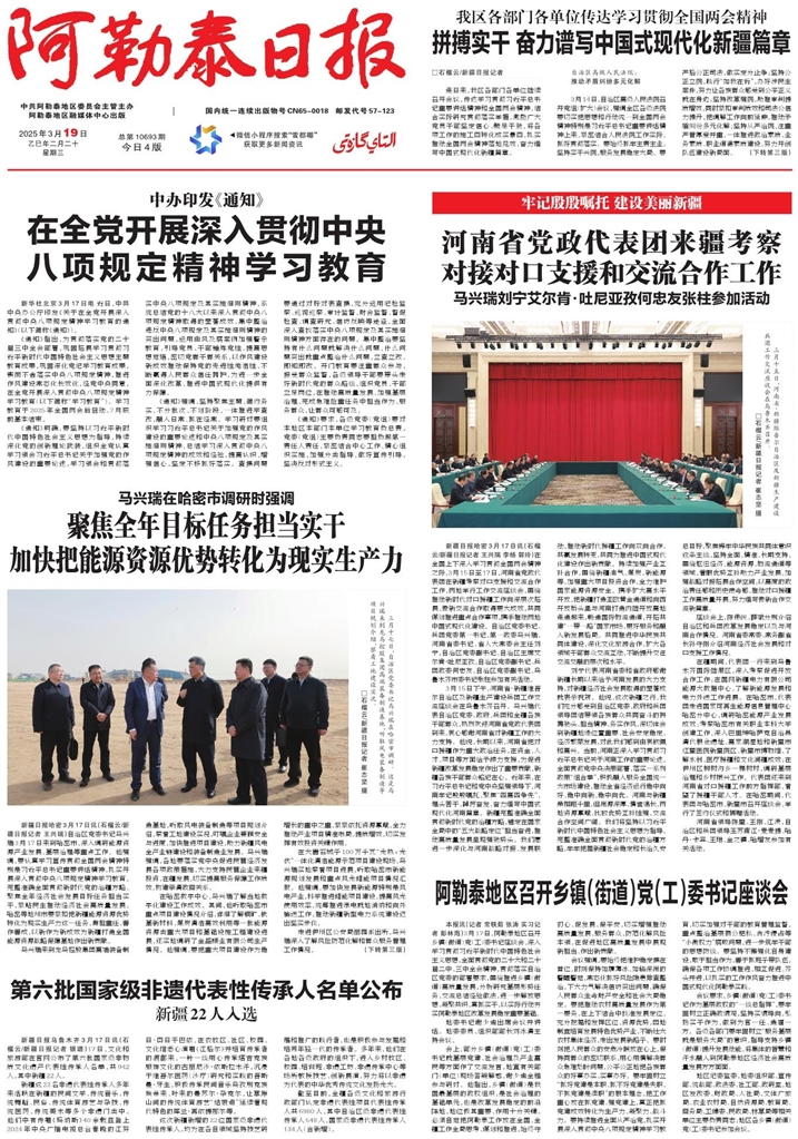 - 河南省党政代表团来疆考察 对接对口支援和交流合作工作 新疆日报哈密3月17日讯(石榴云/新疆日报记者 王兴瑞 李杨 郭玲)在全国上下深入学习贯彻全国两会精神之际,3月15日至17日,河南省党政代表团在新疆考察对口支援和交流合作工作,两地举行工