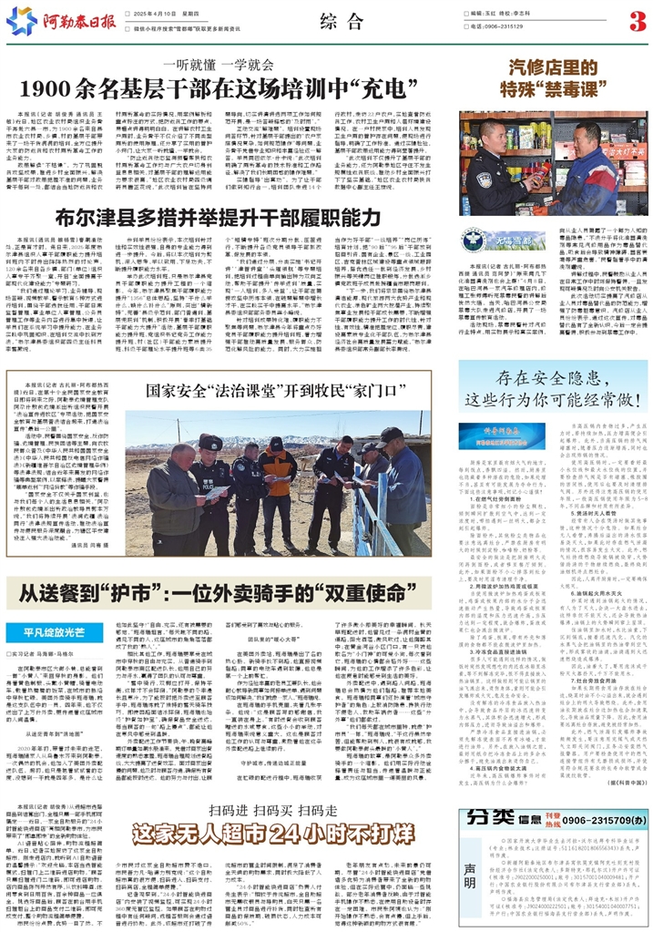 - 国家安全“法治课堂”开到牧民“家门口” 本报讯(记者 古扎丽·阿布都热西提)近日,在第十个全民国家安全教育日即将到来之际,阿勒泰边境管理支队阿尕什敖包边境派出所组织民警开展“法治宣传进牧区”专项活动,把国家安全教育与基层普法结合起来,打