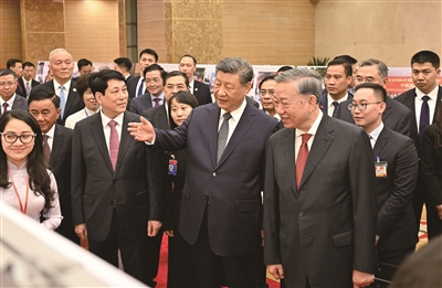 活动前,习近平在苏林、梁强陪同下,观看了中越建交75周年图片展,重温中越双方友好交往的珍贵画面。