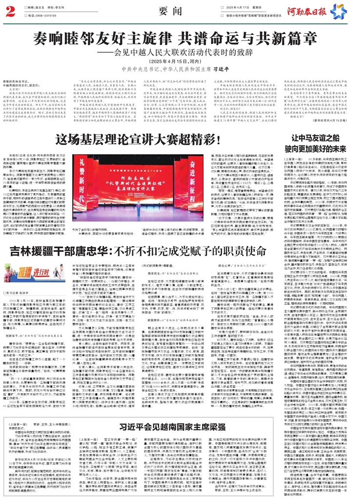 - 奏响睦邻友好主旋律 共谱命运与共新篇章 (2025年4月15日,河内) 中共中央总书记、中华人民共和国主席 习近平 尊敬的苏林总书记, 中越两国的同志们、朋友们: 大家好!