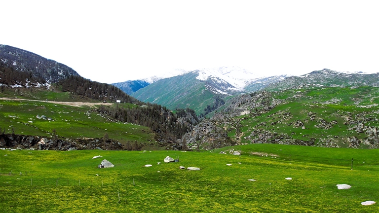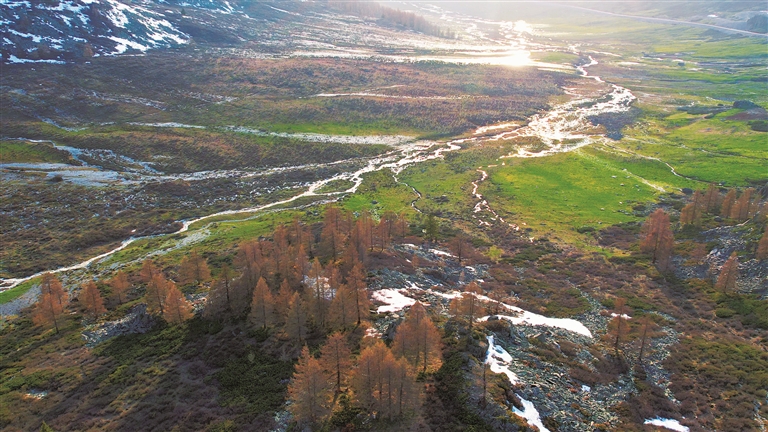 这条两百余公里的景观大道深入阿尔泰山腹地,串起托勒海特草原、通巴盆地原始森林等极致景观,将阿勒泰市的人文底蕴、禾木村的原始风貌、布尔津县河谷的灵秀毓美绘成一条“车在画中行”的梦幻环线。此刻的阿禾,溪流淙淙、草甸如茵,与远处的木屋、挺拔的云杉相映成趣,恍若童话之境。六七月间,野芍药、金莲花等次第绽放,晨雾氤氲更添诗意。