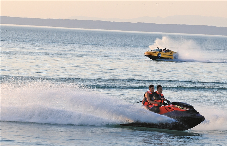 古尔邦节期间,乌伦古湖景区推出丰富的水上娱乐项目,众多市民和游客在这里戏水玩耍,享受美好时光。
