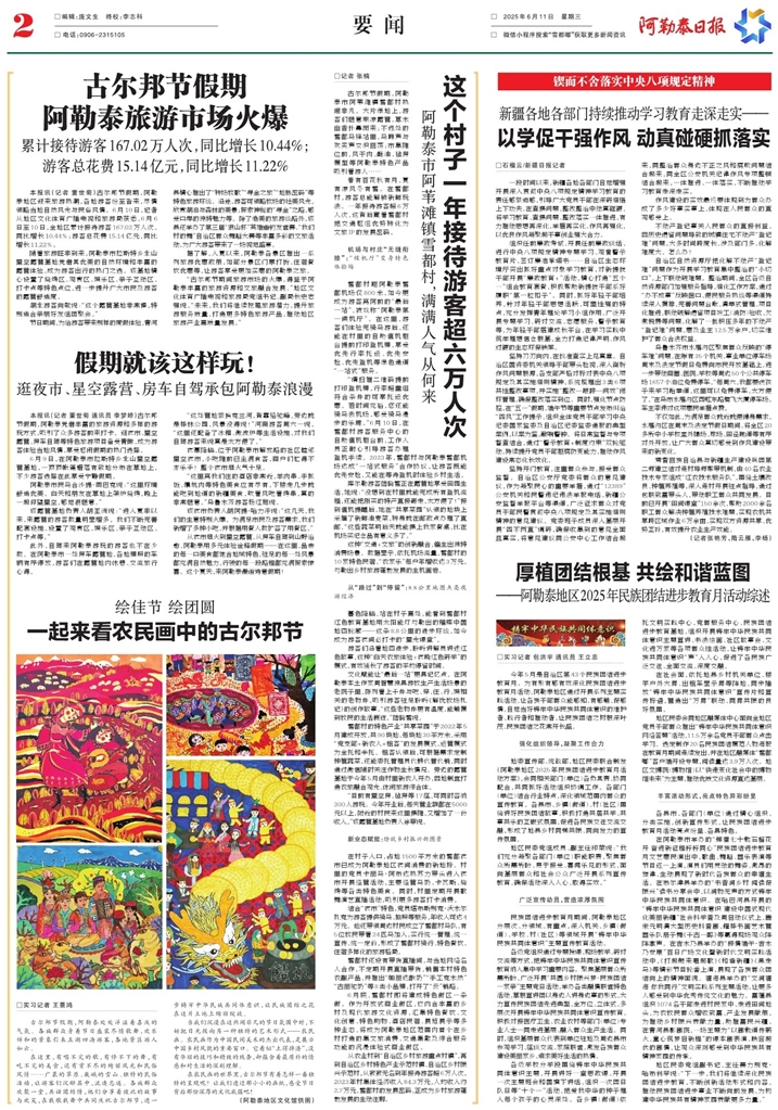 - 厚植团结根基 共绘和谐蓝图 □实习记者 包洪宇 通讯员 王立忠 今年5月是自治区第43个民族团结进步教育月。为有形有感有效深化民族团结进步教育月活动,阿勒泰地区通过