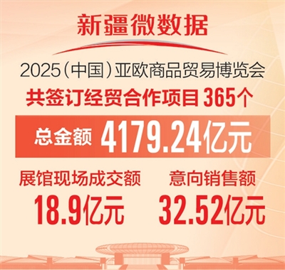 新疆日报乌鲁木齐7月2日讯(石榴云/新疆日报记者 黑宏伟)从2日召开的2025(中国)亚欧商品贸易博览会成果新闻发布会上获悉:2025(中国)亚欧商品贸易博览会共签订经贸合作项目365个,总金额4179.24亿元;展馆现场成交额18.9亿元,意向销售额32.52亿元。