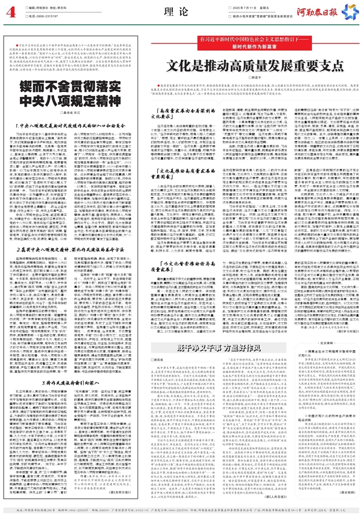 - 文化是推动高质量发展重要支点 □韩喜平 ●高质量发展离不开文化的重要作用,要推动高质量发展,需要以文化赋能经济社会发展,深入挖掘文化资源的经济价值,主动塑造优质社会文化环境。高质量发展是当前我国经济社会发