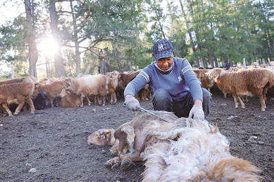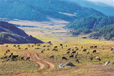 盛夏时节,福海县辉腾阿恰夏牧场,成群阿勒泰羊在雪山融水滋养的草甸悠闲觅食。当地牧民形象描述:“阿勒泰羊吃的是中草药、喝的是低氘水、住的是宝石屋、走的是黄金道。”