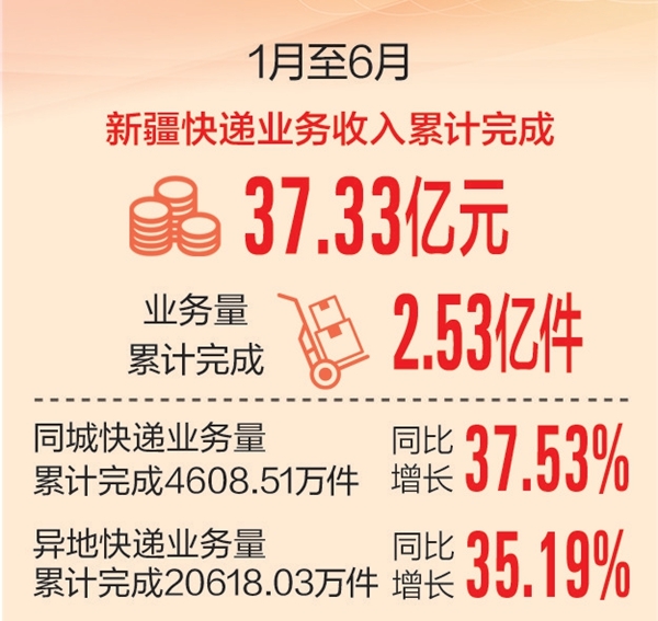 新疆日报乌鲁木齐7月22日讯(石榴云/新疆日报记者 范琼燕)从新疆邮政管理局获悉:今年上半年邮政行业运行情况近日公布,1月至6月,新疆快递业务收入累计完成37.33亿元,业务量累计完成2.53亿件。