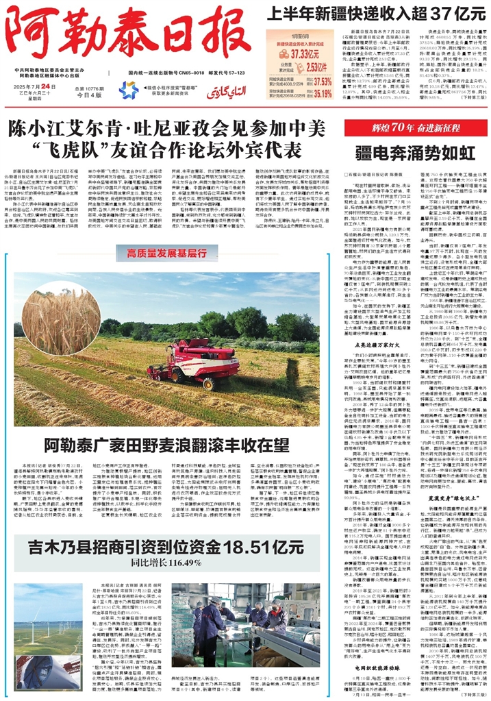 - 阿勒泰广袤田野麦浪翻滚丰收在望 本报讯(记者 胡俊秀)7月22日,福海县解特阿热勒镇别斯朱勒德孜村的小麦田里,收割机正往来穿梭,饱满的麦粒在阳光下闪耀着金色光芒。小麦种植户王龙高兴地说:“今年的小麦长势特别好,是个丰