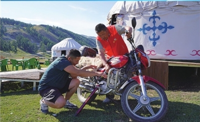 呼吉尔特“石榴籽”服务站党员志愿者为群众修摩托车。通讯员 童俊彦 摄