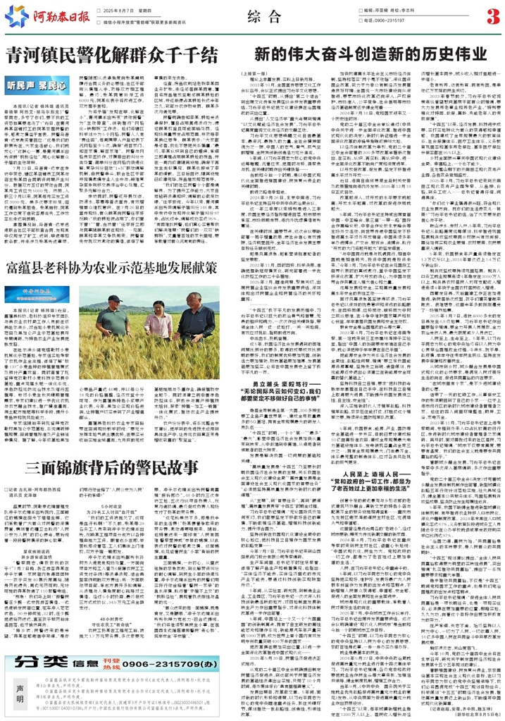 - 三面锦旗背后的警民故事 □记者 古扎丽·阿布都热西提 通讯员 史泽雄 盛夏时节,阿勒泰边境管理支队冲乎尔边境派出所院内,三面鲜红的锦旗在阳光下熠熠生辉。它们承载着广大群众