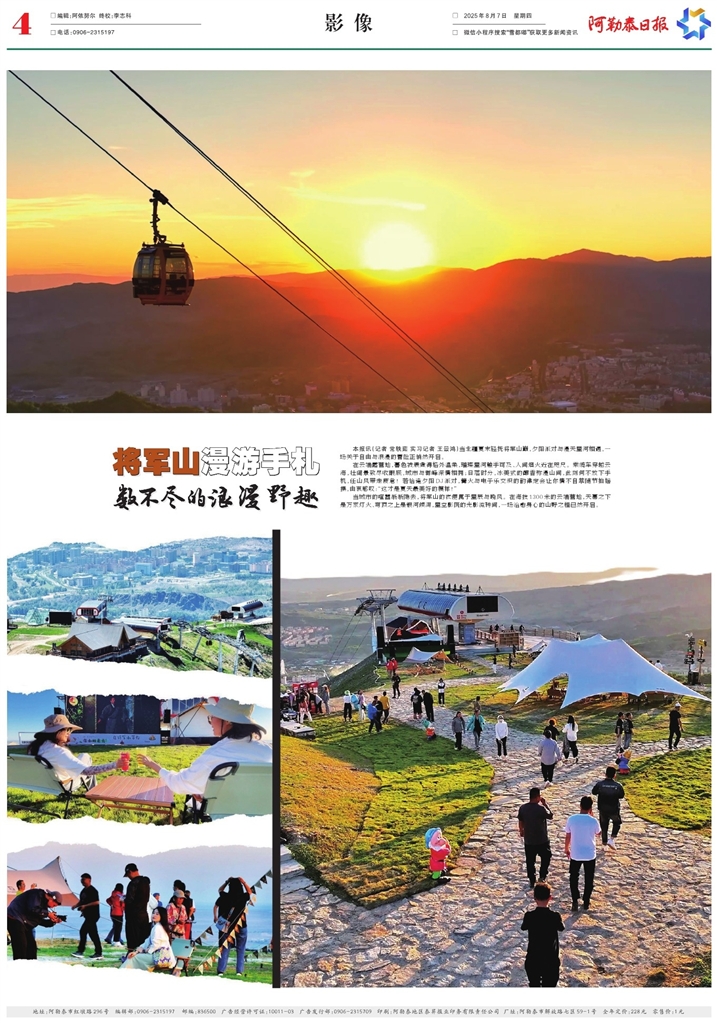 • 将军山漫游手札 数不尽的浪漫野趣   本报讯(记者 常轶茹 实习记者 王景鸿)当北疆夏末轻抚将军山巅,夕阳派对与漫天星河相遇,一场关于自由与浪漫的冒险正悄然开启。   在云端露营地,暮色被煨煮得格外温柔,璀璨星河触手可及、人间烟火